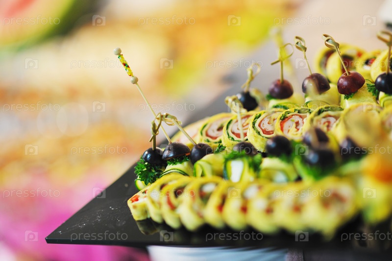 Фрукты, овощи, мясные и рыбные блюда на банкетном столе