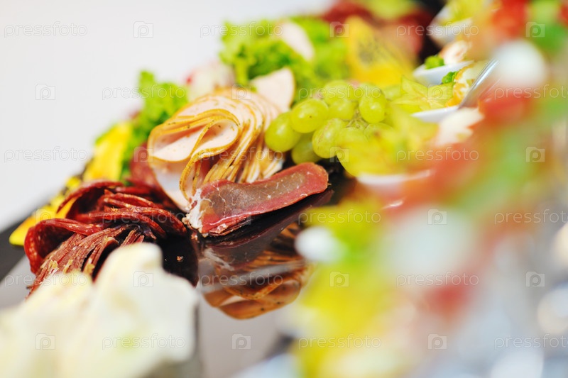 Фрукты, овощи, мясные и рыбные блюда на банкетном столе