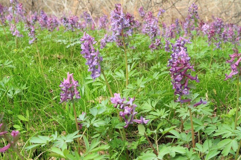 Яркая зеленая трава и первые цветы в весеннем лесу
