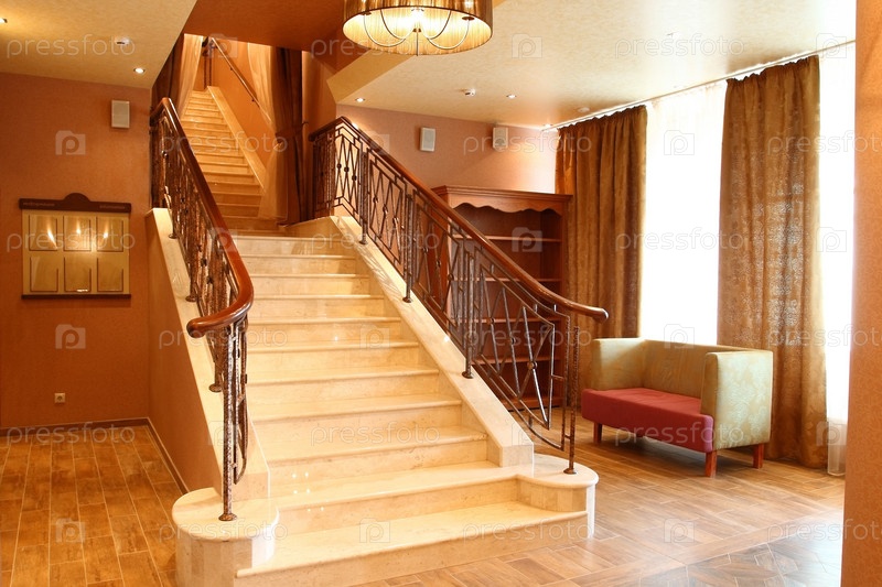 Просторный холл гостиницы, с видом на широкую лестницу