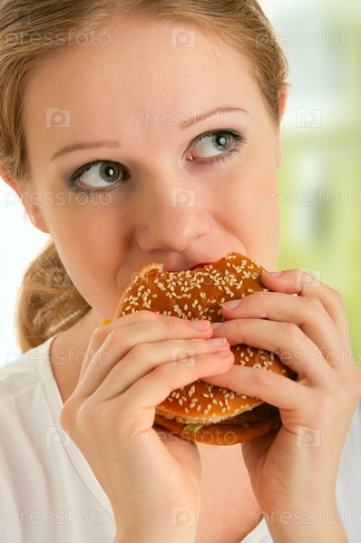 Привлекательная молодая женщина ест гамбургер