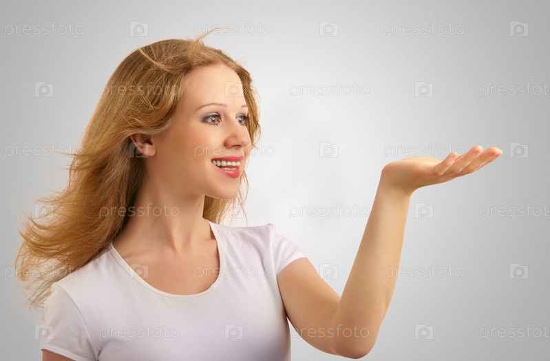 Красивая девушка держит что-то на ладони