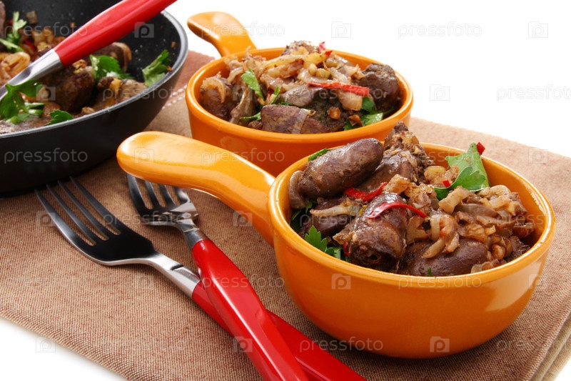 Куриная печень с луком и орехами в керамическом ковше на белом фоне