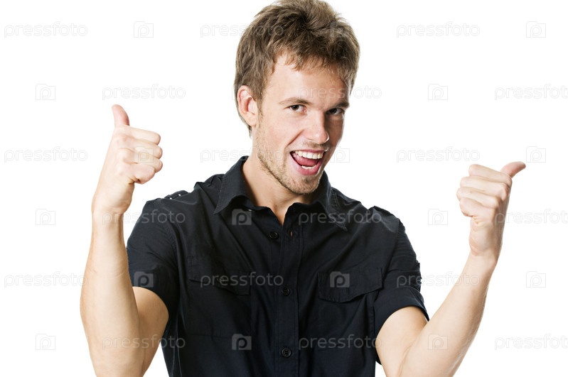 Молодой человек, показывающий двойные большие пальцы вверх изолированный на белом