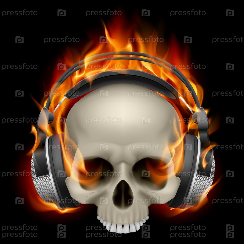 Череп с наушниками в огне, черный фон