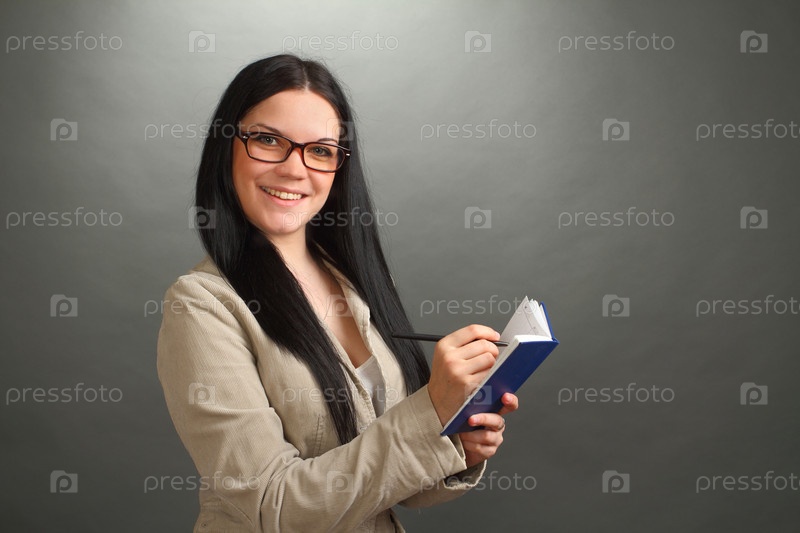 Женщина в очках с ручкой и блокнотом на сером фоне