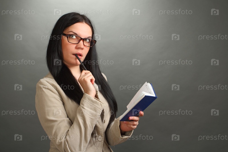 Женщина в очках с ручкой и блокнотом на сером фоне