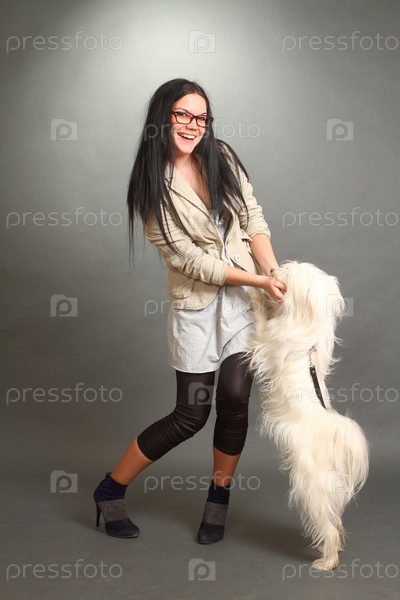 Брюнетка в очках с собакой на селом фоне