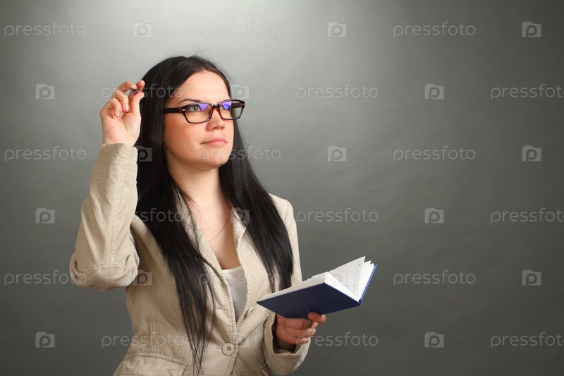 Женщина в очках с ручкой и блокнотом на сером фоне