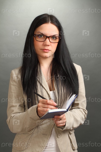 Женщина в очках с ручкой и блокнотом на сером фоне