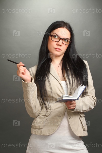 Женщина в очках с ручкой и блокнотом на сером фоне