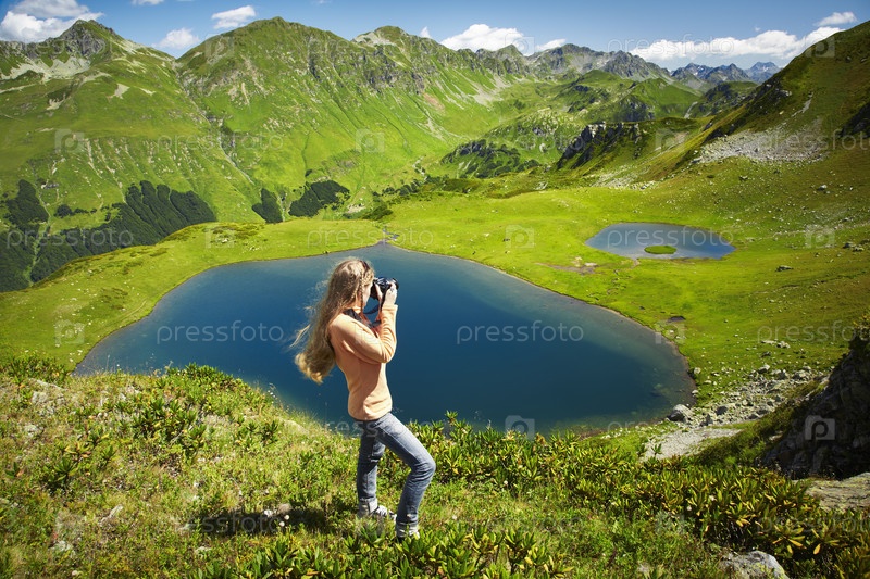 Красивая молодая женщина фотографирует пейзаж