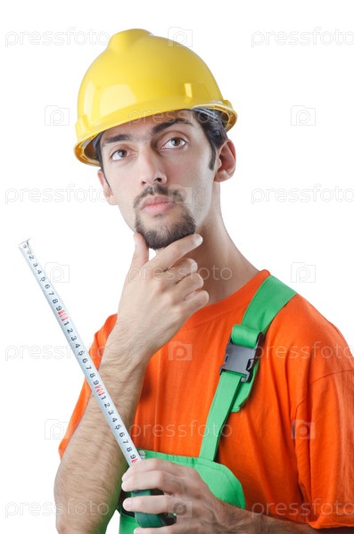 Рабочий с рулеткой на белом фоне