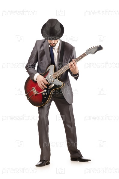 Молодой гитарист на белом фоне