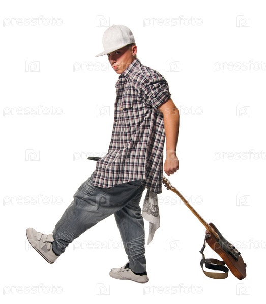 Крутой гитарист со своим инструментом, изолированным на белом