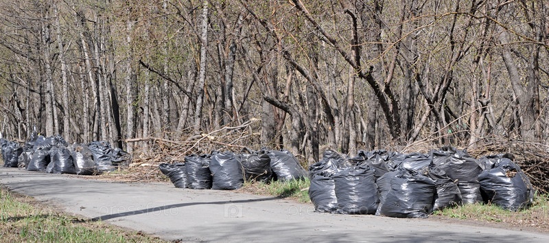 Мешки с мусором вдоль дорожки в парке