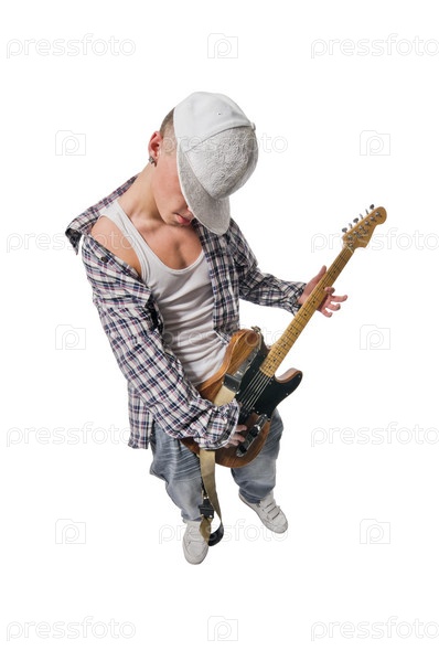 Парень с гитарой на белом фоне