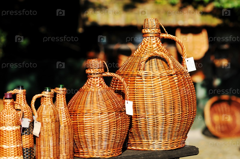 Мебель и посуда из тростника с деревянными украшениями на свежем воздухе