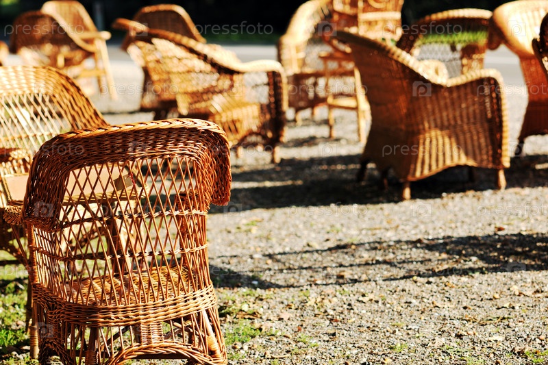 Мебель и посуда из тростника с деревянными украшениями на свежем воздухе
