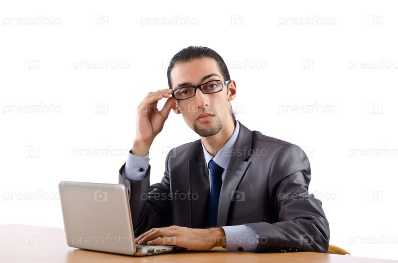 Бизнесмен с ноутбуком на белом фоне