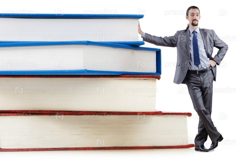Предприниматель с книгами на белом фоне