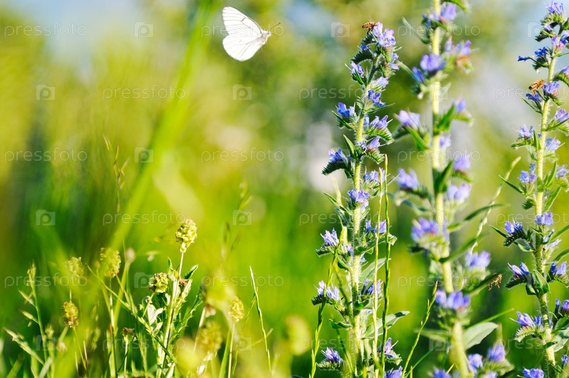 Белая бабочка летает над травой и цветами на лугу в солнечный день