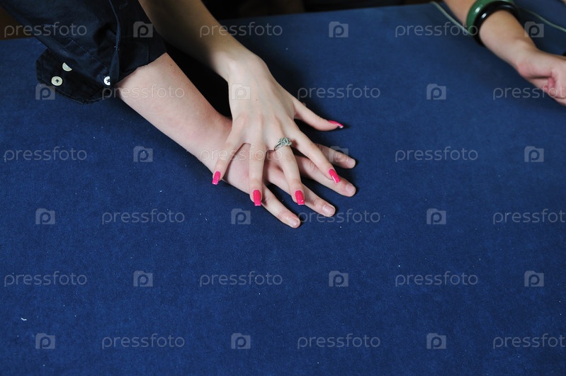 Руки людей, соединенные вместе, на синем столе