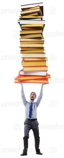 Предприниматель с книгами на белом фоне