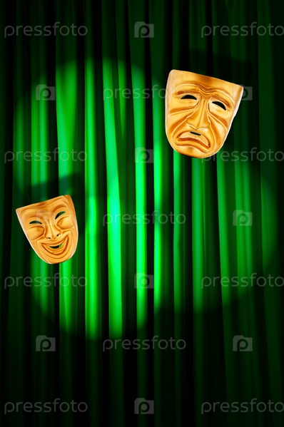 Театральные маски на фоне занавеса