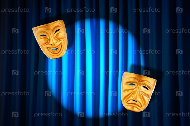 Театральные маски на фоне занавеса