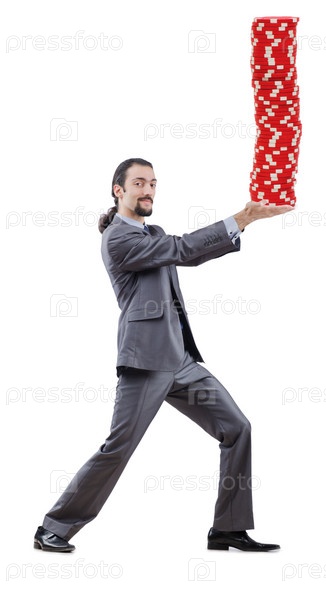 Бизнесмен и фишки казино на белом фоне