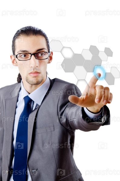 Бизнесмен нажимает на виртуальную кнопку