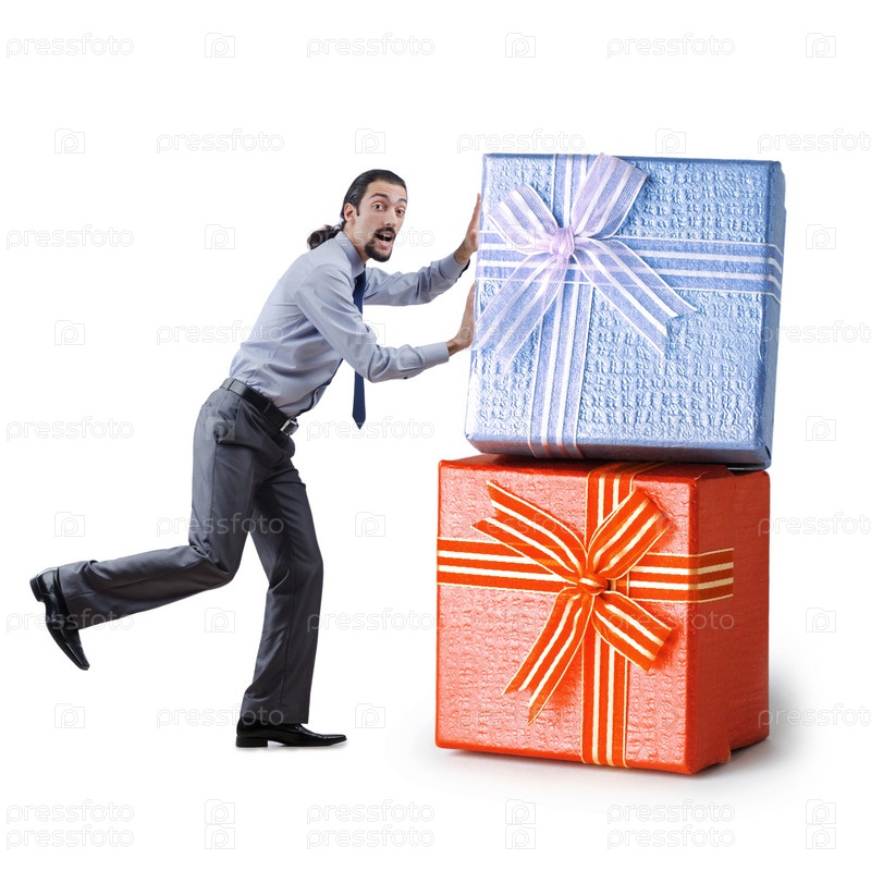 Предприниматель с подарочными коробками на белом фоне