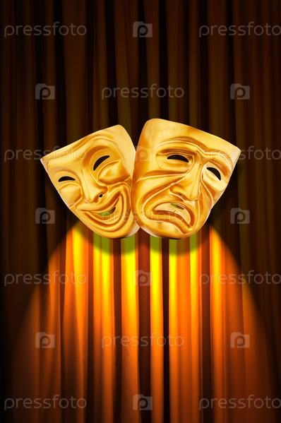 Театральные маски на фоне занавеса