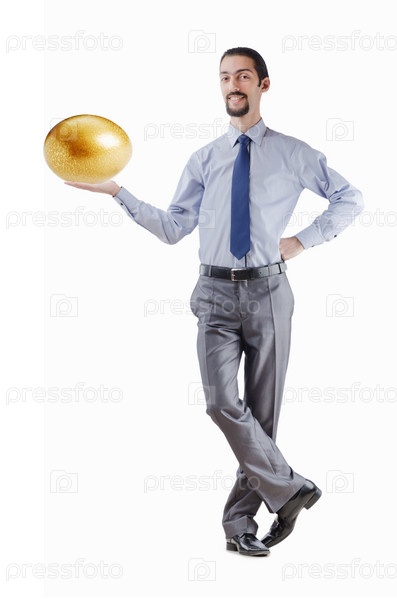 Предприниматель с золотым яйцом на белом фоне