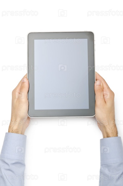 Планшетный компьютер в руках бизнесмена на белом фоне