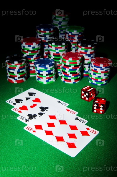 Игральные карты и фишки на зеленом сукне в казино