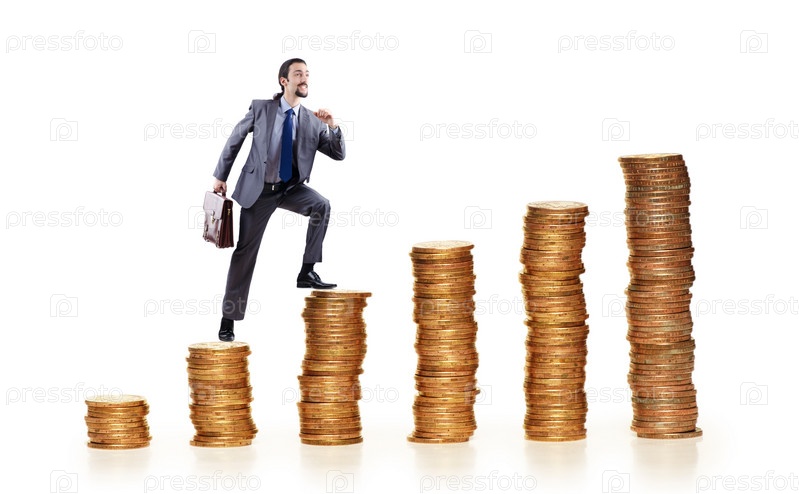 Бизнесмен шагает по стопкам золотых монет