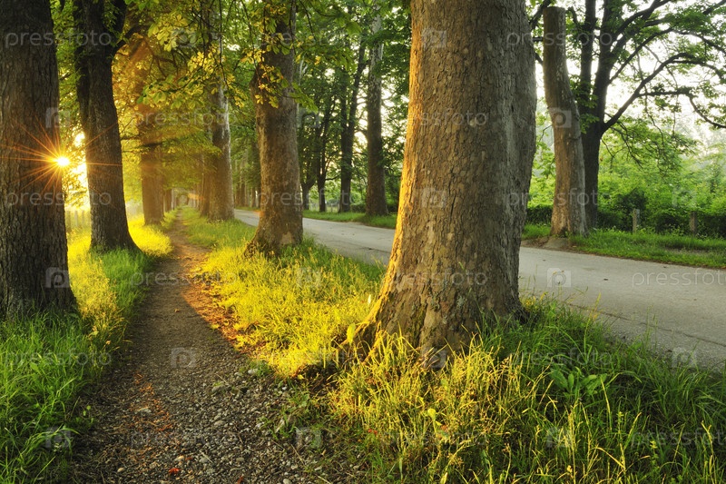 Яркое солнце просвечивает сквозь деревья прекрасным прохладным утром