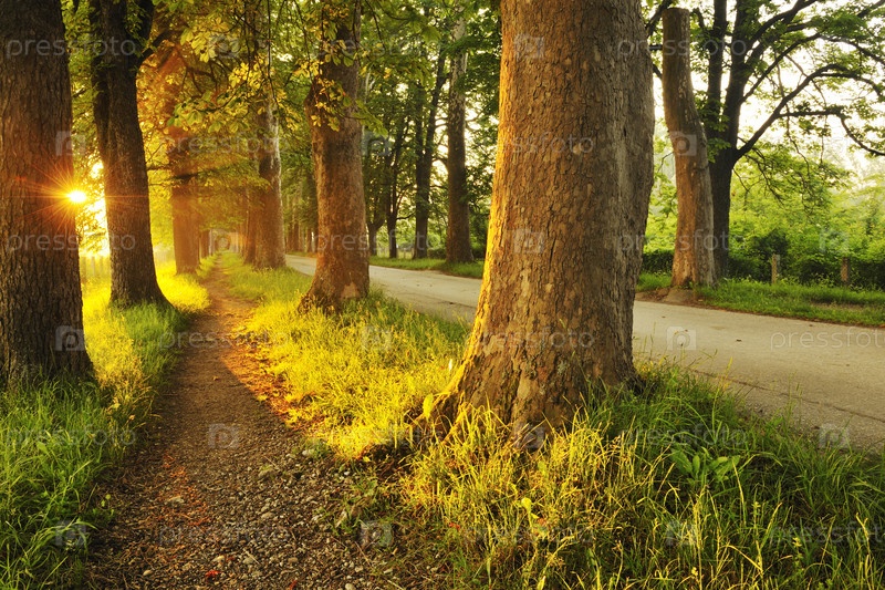 Яркое солнце просвечивает сквозь деревья прекрасным прохладным утром