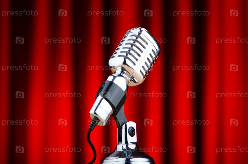Микрофон на фоне красного занавеса