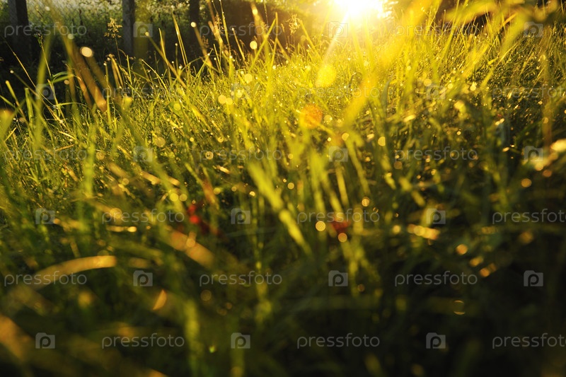 Яркое солнце отражается в каплях росы на траве прекрасным прохладным утром