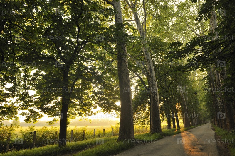 Яркое солнце просвечивает сквозь деревья прекрасным прохладным утром