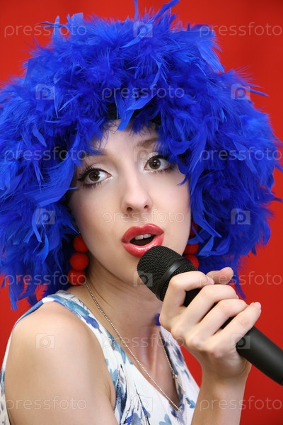Девушка в синем паркие с микрофоном