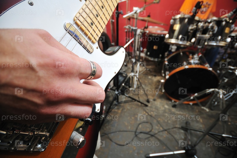 Молодой гитарист играет на домашней гаражной репетиции с группой друзей