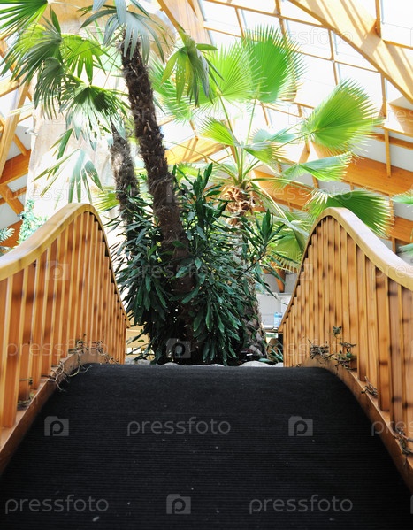 Красивое кафе с пальмами, маленьким водопадом и мостом