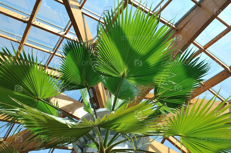 Пальмовые листья под современной застекленной деревянной крышей дома