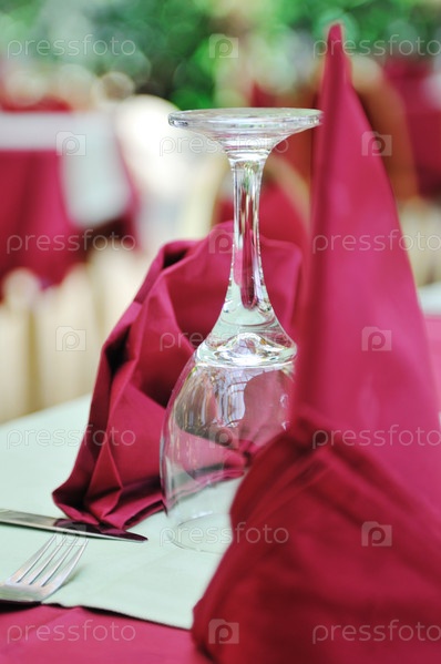 Пустой винный бокал и красные элементы декора на столе в ресторане
