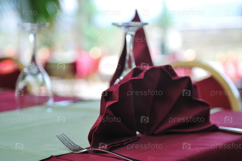 Пустой винный бокал и красные элементы декора на столе в ресторане