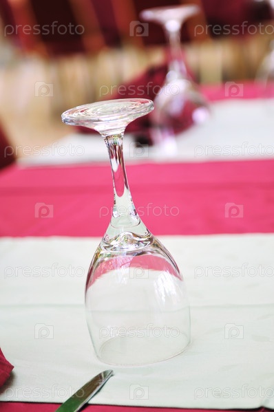 Пустой винный бокал и красные элементы декора на столе в ресторане